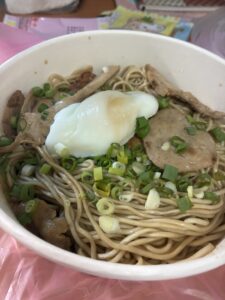 朝からバスに乗って十分と九份へ。まず十分で天燈(ランタン)飛ばしの体験。ランタンの一面に筆と炭で願い事を書いて、空に飛ばす。十分老街の散策。ナッツアイスがあってね。クレープに2種のアイス(私はミルクとパイナップルのアイスをチョイス)、削ったアーモンド、それにパクチーを巻いて食す。なんか不思議な味で美味しかった。九份の海悦楼茶房でランチ。ここは九份で一番有名な阿妹茶房の真ん前。良い写真が取れる。過去2回来た九份はいつも夕方から夜の雨だったけど、この日は昼間で快晴。良い眺めでした。夕食はデリバリーの麺。