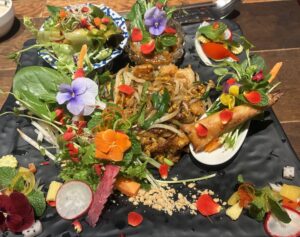 で、バーンタイ芦屋。ランチは肉団子のスープとデザートにメイン。このメインは6種類くらいの中から選べます。ハーブとかエディブルフラワーとかをふんだんに使っていて、とてもカラフル。ワンプレートにサラダとか春巻きとか、なんかチマチマと美しく盛り付けられます。