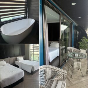 数あるクルーズ会社から、私達が選択したのはドリアクルーズ(Doria Cruise)。客室はこんな感じ。プライベートバルコニーが付いていて、のんびりゆったり船旅を楽しめます。バスタブは利用しなかったけど、シャワーは熱いお湯がたっぷり出て、快適。世界遺産のハロン湾の景色を見ながらの船旅、最高ですよ。